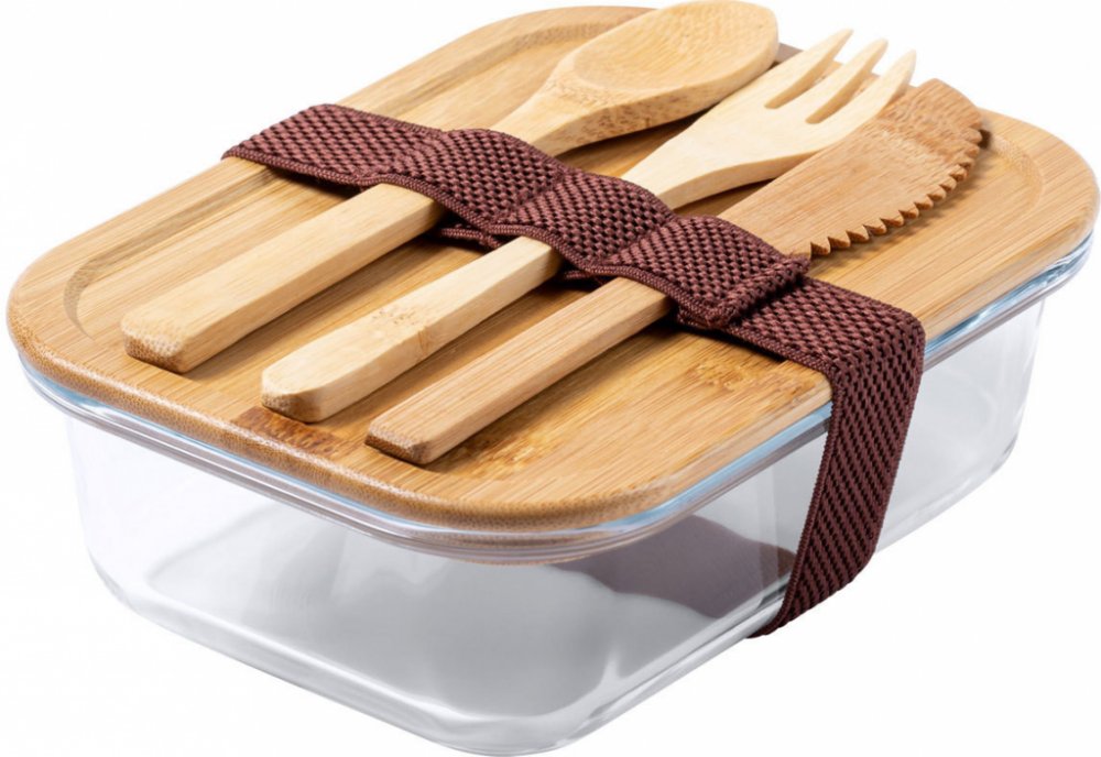Skleněný box na jídlo s víkem z přírodního bambusu. Se sadou příborů z bambusu (nůž, vidlička a lžíce) a elastickým páskem, 500 ml.