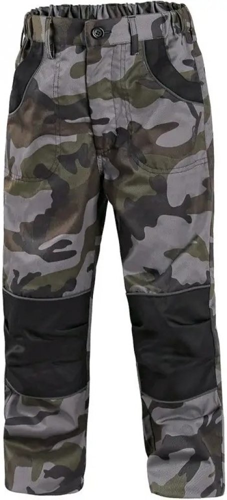 Dětské maskáčové kalhoty se zesílenými koleny a sedem pro delší životnost. Pas s poutky na opasek, vzadu do gumy, přední i zadní kapsy, boční kapsa, reflexní doplňky.