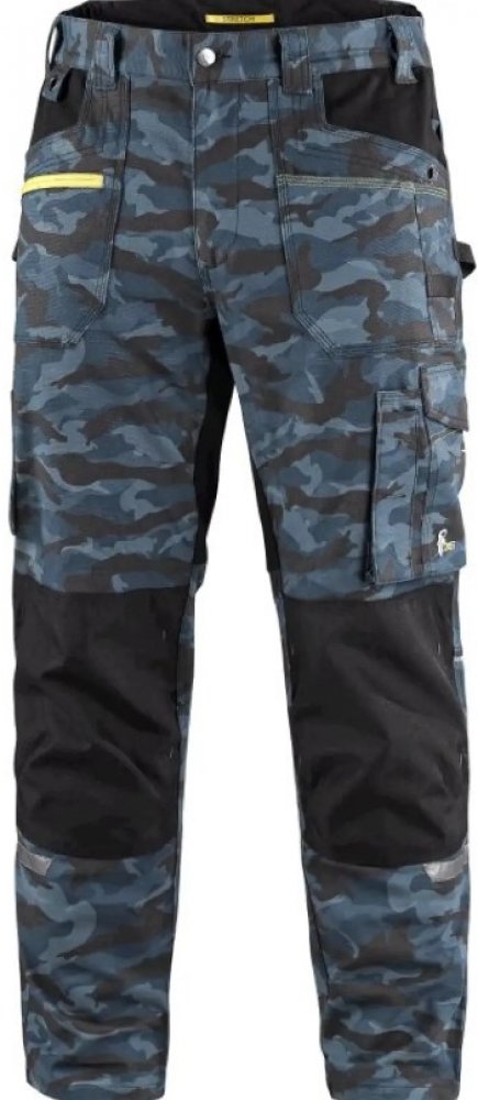 Pánské montérkové kalhoty, strečová tkanina umožňující volný pohyb, pas s poutky na opasek, přední kapsy s kapsou na zip, multifunkční kapsy na obou stranách, kolena zesílena 600D polyesterem s možností vložení kolenních výztuh, dvě zadní kapsy - jedna s klopou, zadní spodní lem nohavice vyztužen 600D polyesterem, reflexní doplňky.