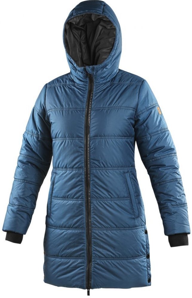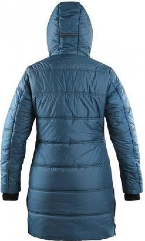 Dámský zateplený kabát s kapucí a bočním rozparkem na druky. Boční kapsy na zip, rukávy ukončeny pružnou manžetou, černé reflexní doplňky na kapuci, rozparku a podél hlavního zipu, vnitřní kapsa na zip.