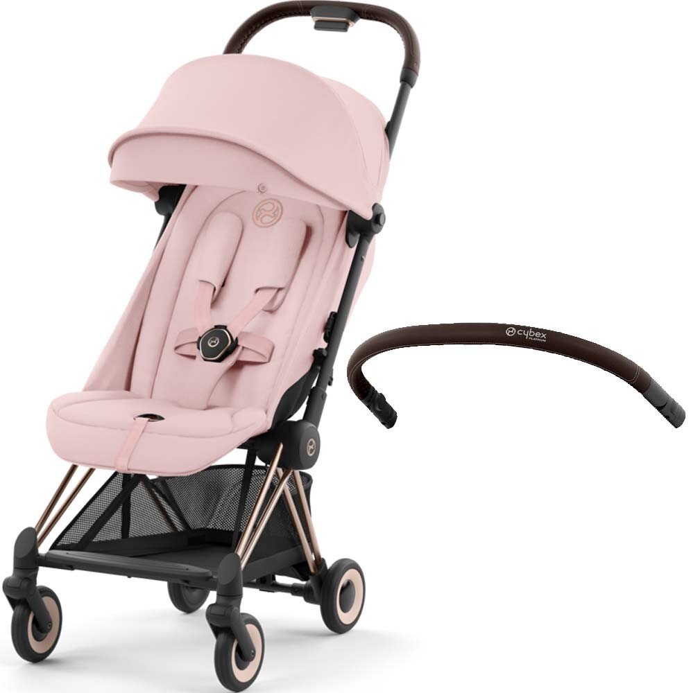 Set obsahuje: podvozek CYBEX Coya Rosegold + jednotku sedačky (pevné součásti a textilní výrobky) + sluneční stříšku + nákupní košík + popruh na přenášení