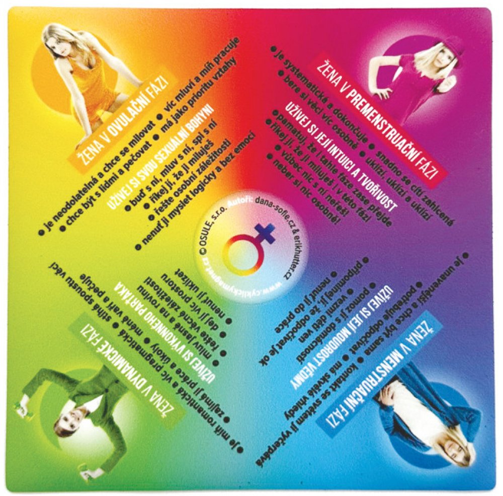 Pokud se mužům zdá, že je jejich žena každý den jiná, pomůže jim porozumět cyklický magnet, který snadno a rychle vysvětlí, v jaké fázi se žena nachází, co v dané fázi cítí, co potřebuje. Magnet usnadní komunikaci mezi mužem a ženou, protože muž díky němu přesně ví, kdy má žena fázi nejvhodnější k naslouchání, ne...