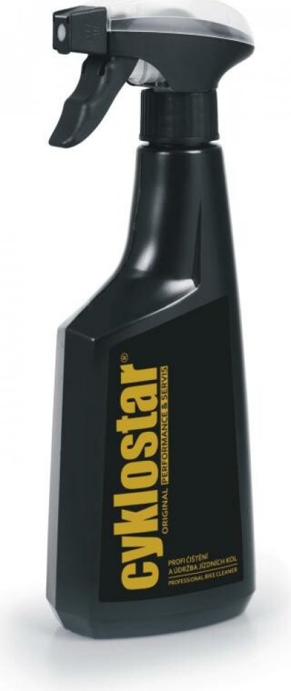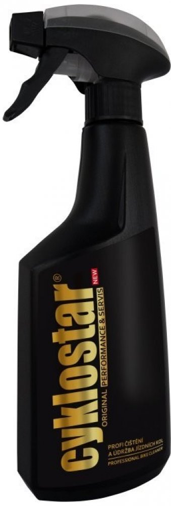 Čistič kol CykloStar originál Performance & Servis 0.5l rozprašovač - profesionální, vysoce účinný prostředek na čištění a údržbu jízdních kol, s tradicí a vývojem od roku 1993. Čistič kol CykloStar originál Performance & Servis 0.5l rozprašovač - profesionální, vysoce účinný prostředek na čištění a údržbu jízdních kol, s tradicí a vývojem od roku 1993. Snadno, rychle, účinně a pohodlně odstraňuje provozní nečistoty, maziva, oleje, vazelíny a mastnotu z povrchu závodních speciálů a všech ostatních typů jízdních kol a jejich součástí. Používá a doporučuje reprezentace České republiky v cyklistice - Nový typ PERFORMANCE & SERVIS s maximálně silným, razantním a rychlým účinkem. - Vyvinuto pro profesionální, servisní a týmové použití. - Jedinečný mycí výkon při zachování šetrnosti a bezpečného použití. - Určen na rámy, řetězy, převodové ústrojí a ostatní součásti. - Použití také jako náplň pro pračky řetězů. - Biologicky odbouratelný (dle nařízení č. 648/2004). - Nejvýkonnější CYKLOSTAR ORIGINAL všech dob. - Aplikace: Pomocí duálního rozprašovače „spray / stream“ nastříkejte na znečištěná místa jízdního kola (rám, převodníky, řetěz, přesmykače, ráfky,pedály, ostatní součásti). Nechte krátce působit, případně rozetřete a čistěte.