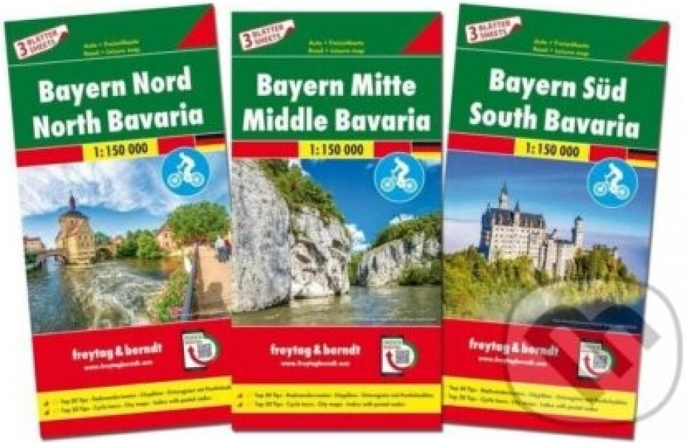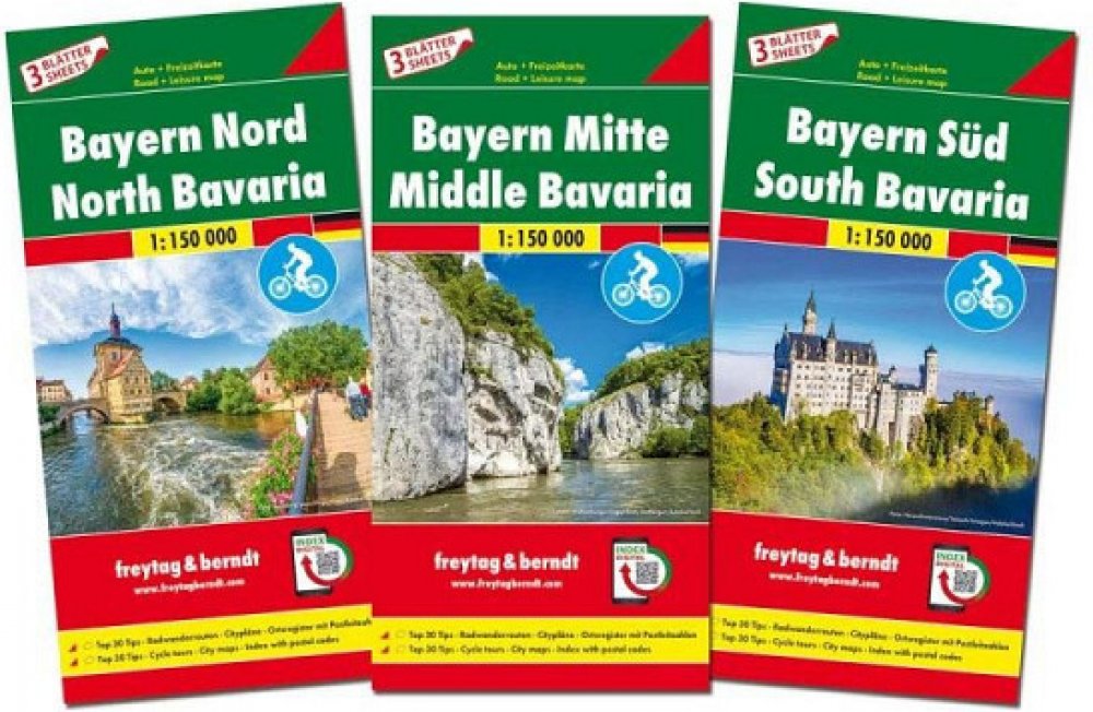Sada map do auta se 3 listy, oboustranně potištěná. Měřítko 1:150 000, Top 30 tipů Památky, cyklistické trasy, Kempy a karavany, Přiložený informační průvodce stručně popisuje 30 nejkrásnějších památek v němčině a angličtině. ***** Mapy měst Augsburg, Mnichov, Frankfurt, Innsbruck, Norimberk, Pasov, Řezno, Salzburg, Ulm a Würzburg