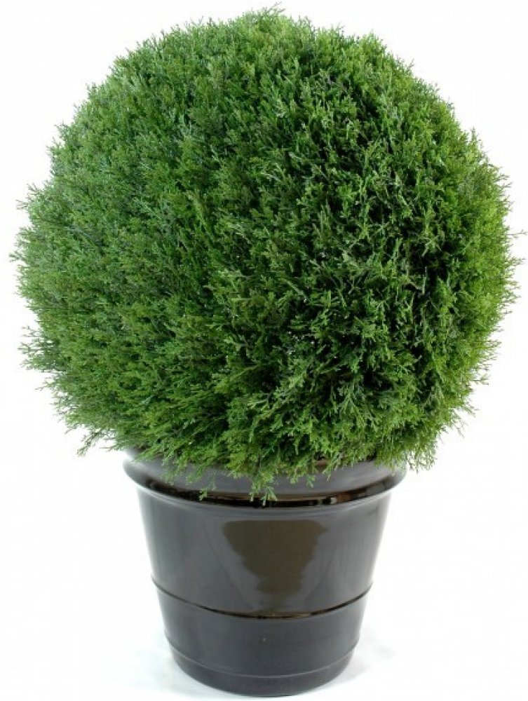 Poutavý umělý jehličnan CYPŘIŠ KOULE MINI NEW je vysoký vč. kotvícího květináče 80cm s průměrem koule 55cm. Cypřiš venkovní má husté zelené jehličí z PE UV. Dodává se v kotvícím květináči z PVC (většinou se liší od obrázku). Kotvící květináč je určen k vložení do většího dekoračníího květináče. Cypřiš stálezelený je vhodný i k dekoraci do exteriérů. Hmotnost umělé cypřišové koule: 7,70kg.