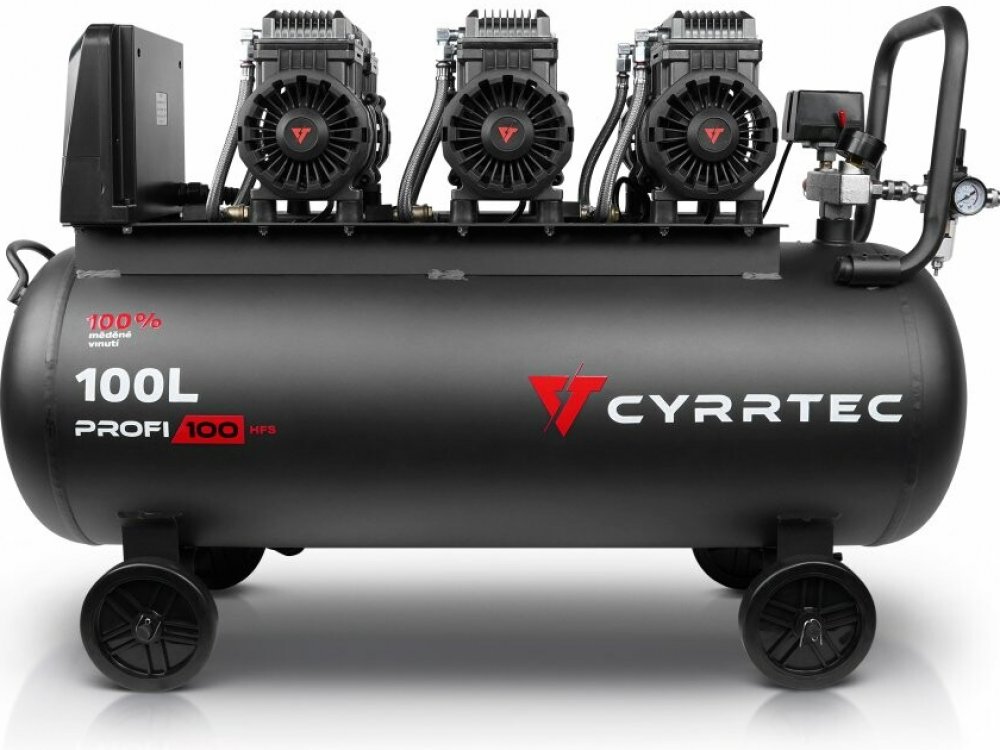 Pokud potřebujete ještě větší vzdušník a vyšší výkon, doporučujeme CYRRTEC PROFI 150 HFS se čtyřmi jednotkami a objemem 150 l. Stejně jako Profi 100 HFS je i model 150 HFS vybaven inteligentním mikroprocesorovým řízením pro maximální efektivitu, ochranu stroje a minimální proudové zatížení sítě.