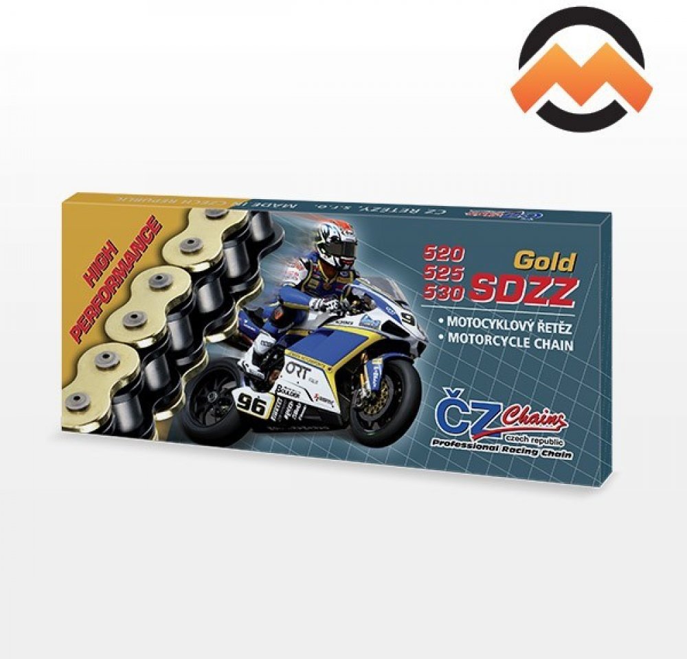 Řetězová sada s ČZ HX-ring GOLD, HONDA CBR 600 F rok výroby 1999-2000, Řetěz ČZ 525 SDZZ, X-ring, zlatý, počet článků 108, kolečko 1370-16 zubů, rozeta 1304-44 zubů. Sada obsahuje: