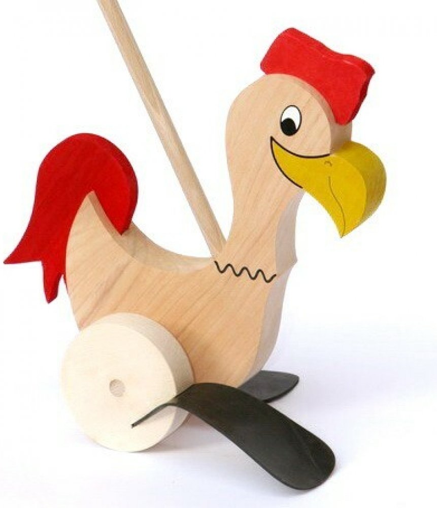 Dřevěný kohout na tyči s červeným ocasem. Při točení koleček pěkně plácá nohama o zem.