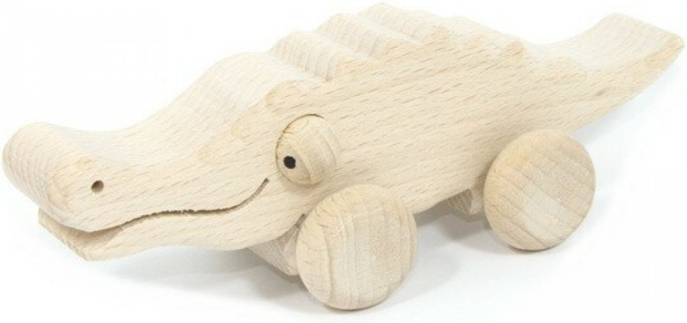 Dřevěné přírodní zvířátko na kolečkách - Krokodýl. Zvířátko je vyrobeno z tvrdého bukového dřeva, má hladké hrany, zaoblené tvary a jedinečný vzhled s legračně vypoulenýma očima. Tělo je silné 2,4 cm a proto se dětem dobře drží v rukou.