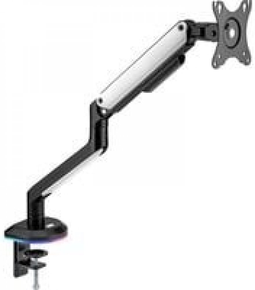 Držák herního monitoru s RGB podsvícením. Pro monitory 17–32". Rameno disponuje mechanickou pružinou. Materiál ocel / hliník / plast. Prášková povrchová úprava. Kompatibilní s VESA 75×75 / 100×100. Rozsah otáčení +90° až -90°. Rotace obrazovky +180° až -180°. Max. prodloužení paže 453 mm. Instalace svorka 10–80 mm / průchodka 10–40 mm. Chytrá správa kabelů. Nosnost 9 kg. Rozměry 117 × 503 × 613 mm...