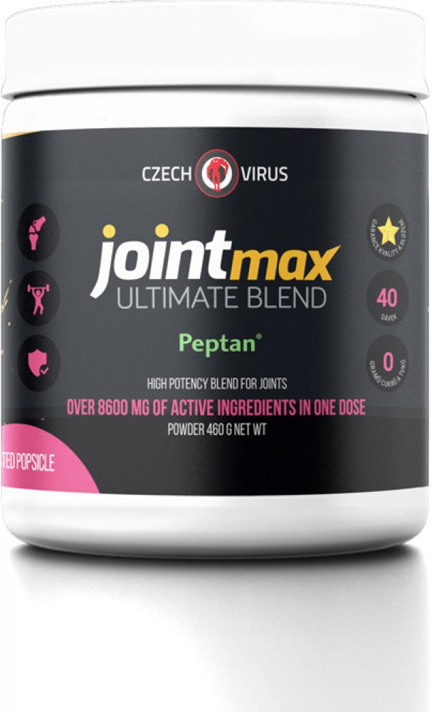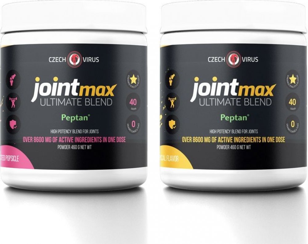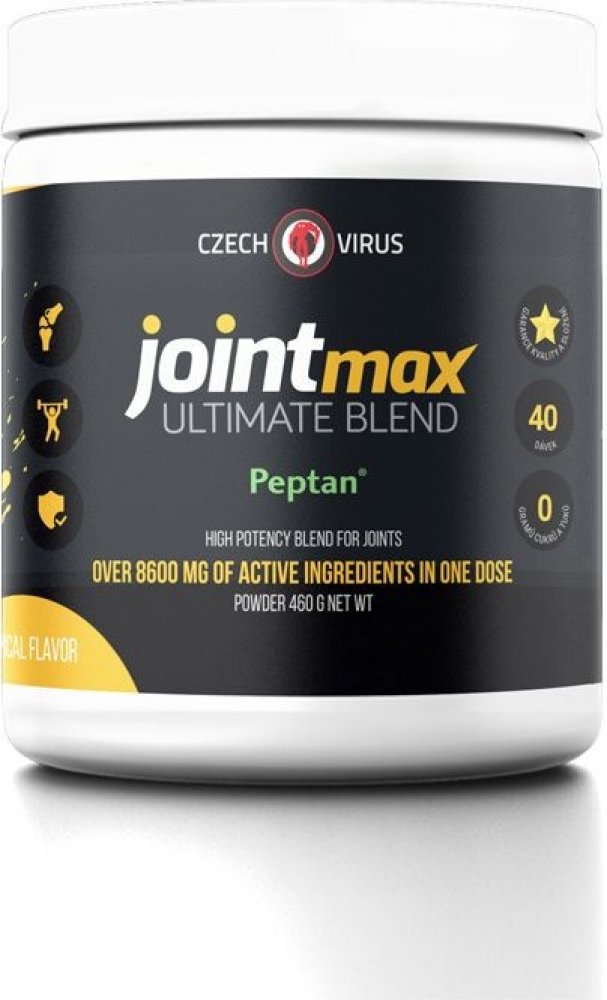 Joint MAX Ultimate Blend je horkou novinkou z dílny nejoriginálnější české značky Czech Virus®. Jedná se o komplexní kloubní výživu s vysokým obsahem funkčních látek v jedné dávce (přes 8600 mg!!). Promyšlené složení cílí na celkový stav kloubů (chrupavky, pojivová tkáň, záněty, rozsah pohybu...) a bylo navrženo podle nejaktuálnějších poznatků v této oblasti. Velkou výhodou tohoto produktu je také dobrá rozpustnost a skvělá chuť - neuvěříte, že pijete kloubní výživu. A to vše navíc absolutně BEZ CUKRU!