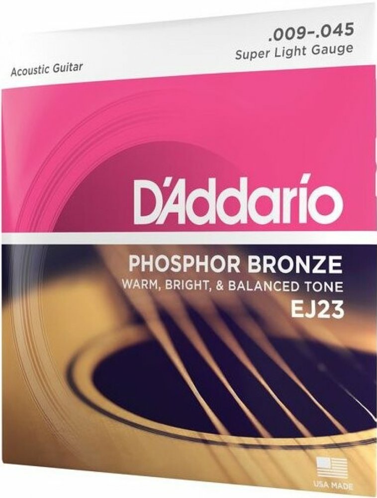 Fosfor-bronzové struny D’Addario EJ23 na akustickou kytaru, super light, .009–.045 Fosfor-bronzové struny D’Addario na akustickou kytaru. Fosfor-bronz začala jako materiál na struny používat v roce 1974 právě firma D‘Addario, protože struny z tohoto materiálu mají jasný, teplý a vyvážený akustický tón, který je vhodný pro všechny možné žánry. Šestihranné jádro strun je ocelové. Síla strun v tomto balení je Super Light: .009, .012, .015, .025, .035, 045.