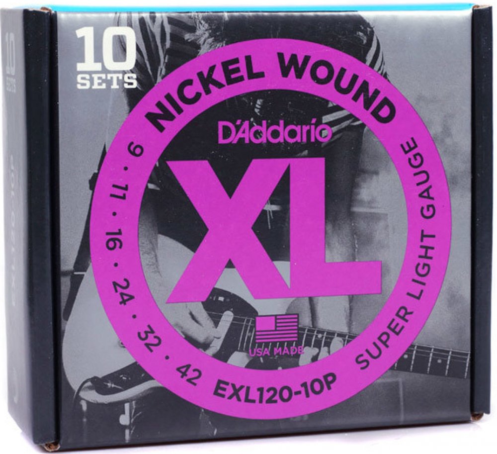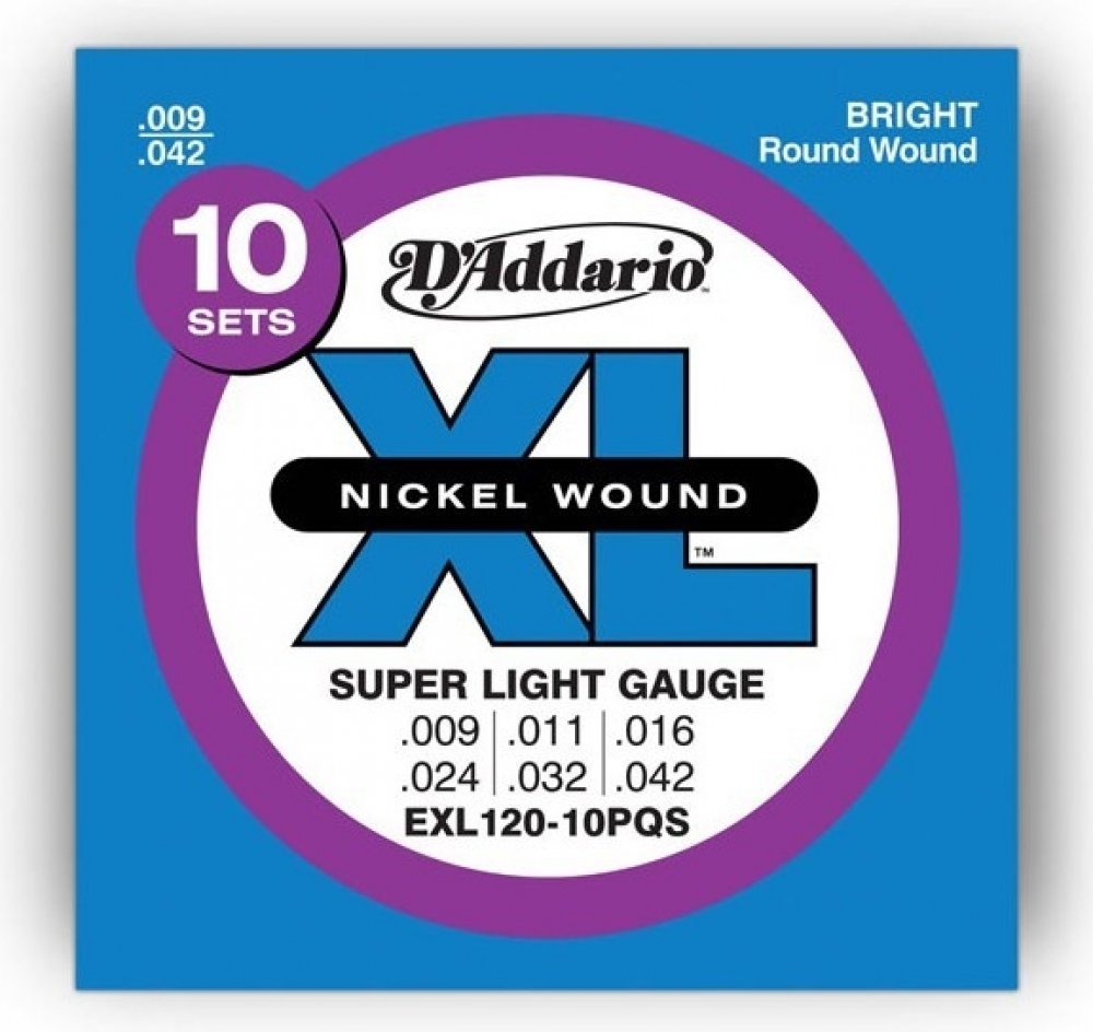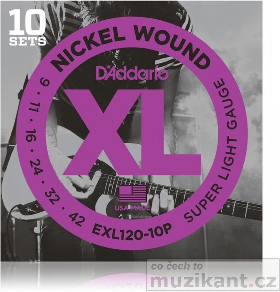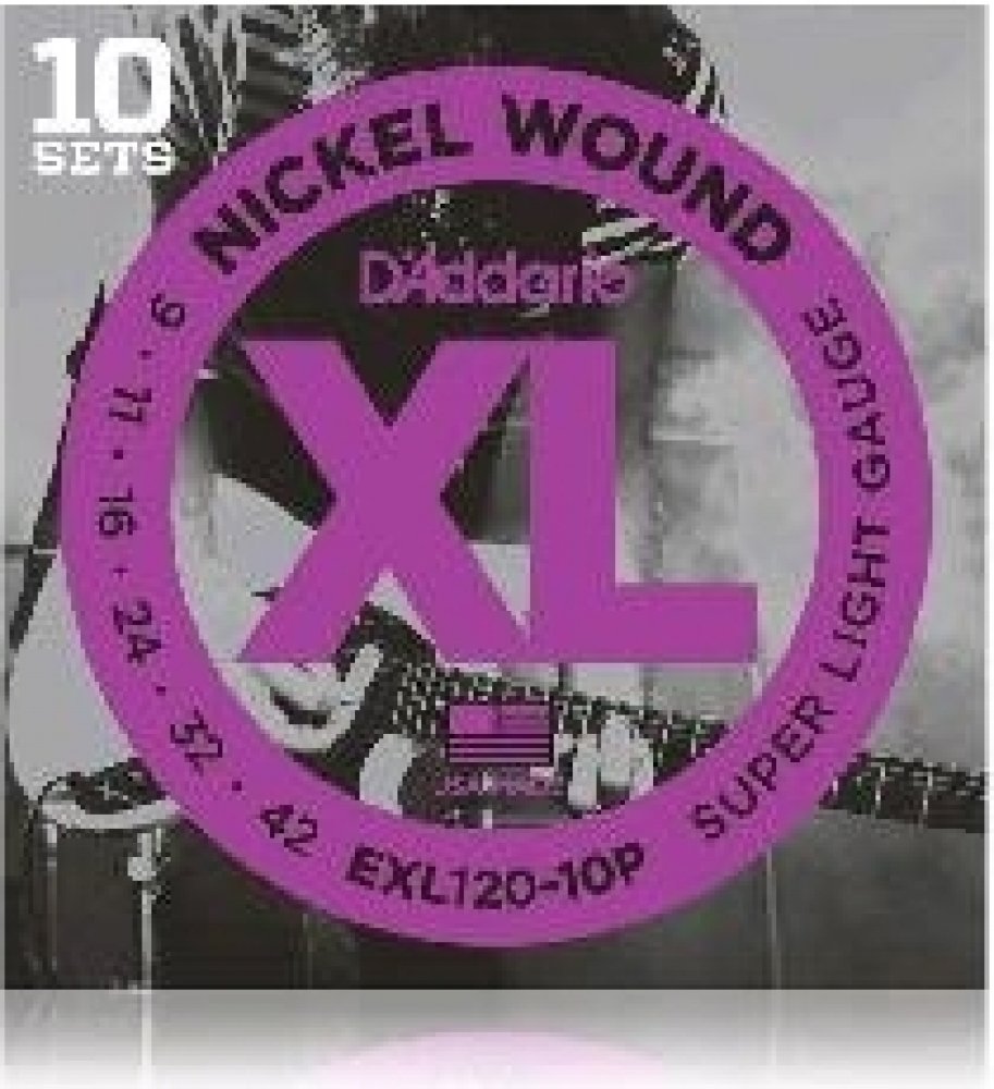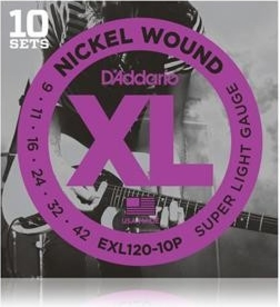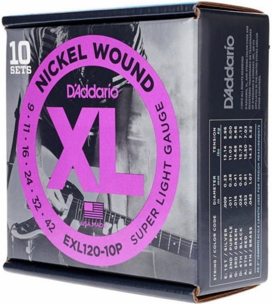 Struny pro elektrickou kytaru. XL Nickel Wound jsou nejpopulárnější struny pro elektrickou kytaru společnosti D'Addario. Drát vyrobený z niklem potažené oceli je vinutý na šestihranném jádru z uhlíkové oceli. Výsledkem jsou struny s dlouhou životností, výrazným jasným tónem a vynikající intonací. Struny jsou vhodné pro různé hudební žánry a modely kytar. Tloušťka s označením Super light přináší flexibilní struny s výrazným zvukem. Balení obsahuje 10 sad. Tloušťka strun: . 009, . 011, . 016, . 024, . 032, . 042