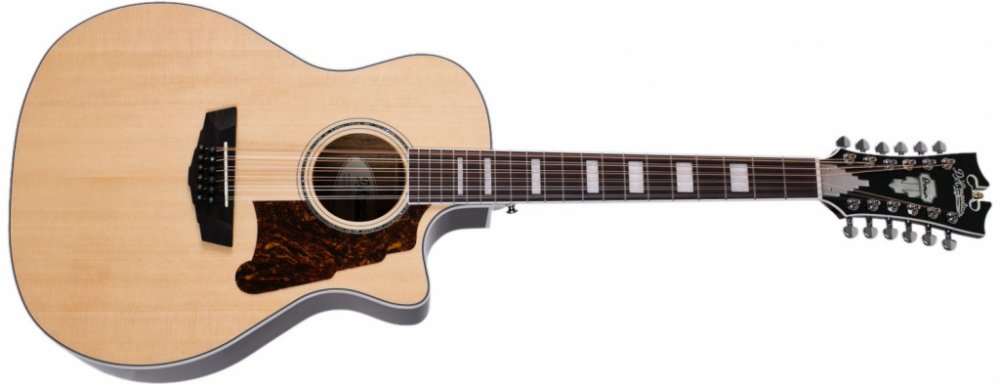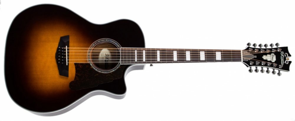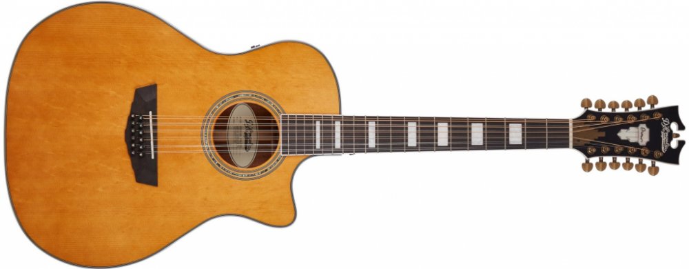 Dvanáctistrunná elektroakustická kytara D’Angelico Premier Fulton je polomasivní dvanáctistrunná elektroakustická kytara v populárním tvaru Grand Auditorium, která vás potěší pěkným designem a vyváženým poměrem robustních basů a jasných výšek. Přední deska kytary je zhotovena z masivního smrku Sitka, zadní deska a luby z laminovaného mahagonu. Dobré akustické vlastnosti kytary podporuje snížené X žebrování (Scalloped X). K mahagonovému krku s užším „C“ profilem je přilepen hmatník z ovangkolu osazený dvaceti pražci. Orientaci po jeho ploše usnadňují polohové bloky z imitace perleti. Tělo kytary vyvažuje hlavice v tradičním tvaru nástrojů D´Angelico ozdobená perleťovým firemním logem (Mother-of-Pearl). Struny jsou přes sedlový a nultý pražec z kosti uchyceny v již zmíněných firemních mechanikách v provedení Antique Bronze a kobylce z ovangkolu. Vzhled nástroje zpestřuje rozeta složená z prstenců z perleti (Abalone) a ABS, světlá lemovka těla a hmatníku doplněná černými linkami nebo ebenové kolíčky do kobylky s perleťovými tečkami. O ozvučení nástroje se stará preamp D’Angelico s integrovanou ladičkou zabudovaný do lubu kytary.