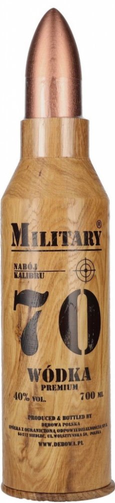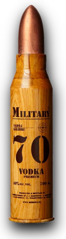 Láhev Debowa Military 70 Vodka Premium má dřevěný obal ve tvaru nábojnice. Impozantní obal obsahuje oblíbenou vodku Debowa Polska.