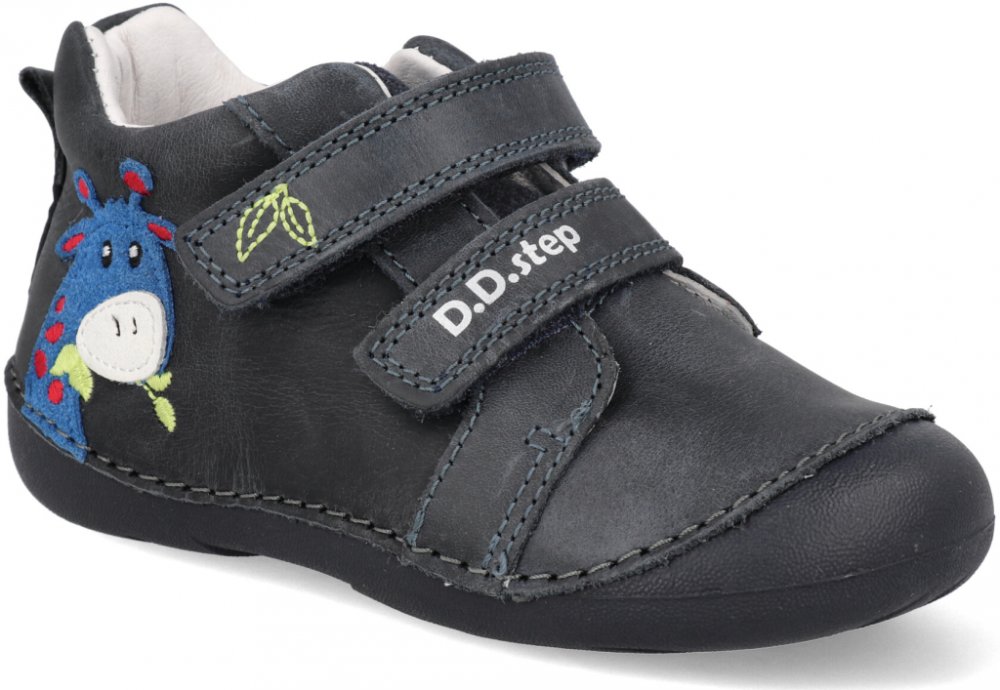 Kotníčková kompromisní obuv na suchý zip od maďarské firmy D.D.step se vyznačuje vysokým pohodlím a komfortem s atraktivním vzhledem. Obuv je lehká a flexibilní. Svršek, podšívka: kůže. Protiskluzová podešev 100 přírodní pryž. Vyvýšená podešev zabraňuje okopání. Vyjímatelná kožená stélka. Pevný opatek.Délka x šířka stélky: vel.18- 117 x 52mm, vel.19- 124 x 54mm, vel.20- 131 x 55mm, vel.21- 137 x 5...