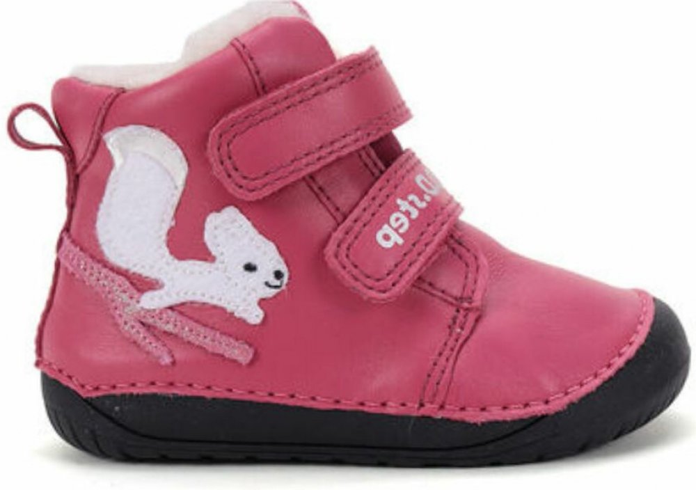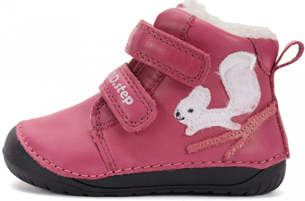 Zimní boty DD step W070-52214B Dark Pink z hladké kůže v růžové barvě s motivem veverky. Jsou bez membrány, takže nejsou nepromokavé.