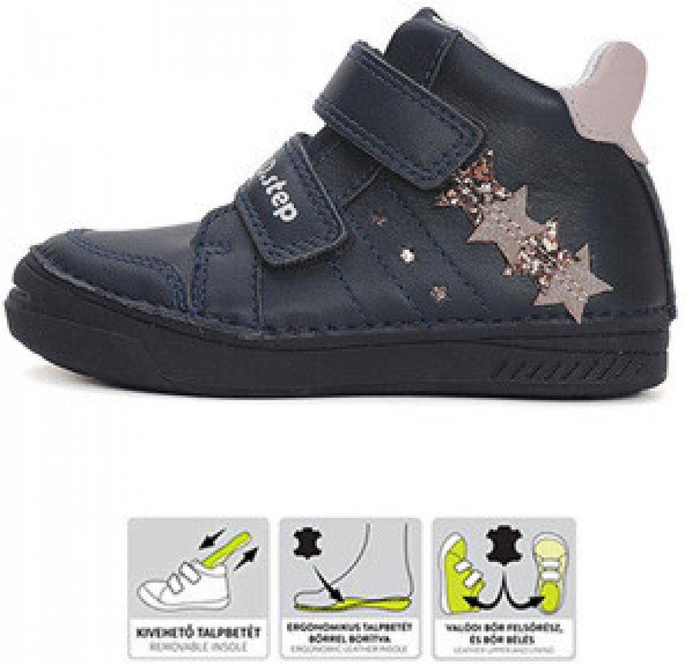 Celoroční kotníkové boty D.D.Step, které jsou vhodné pro normální a širší chodidla. Podrážka bot je měkká a ohebná.