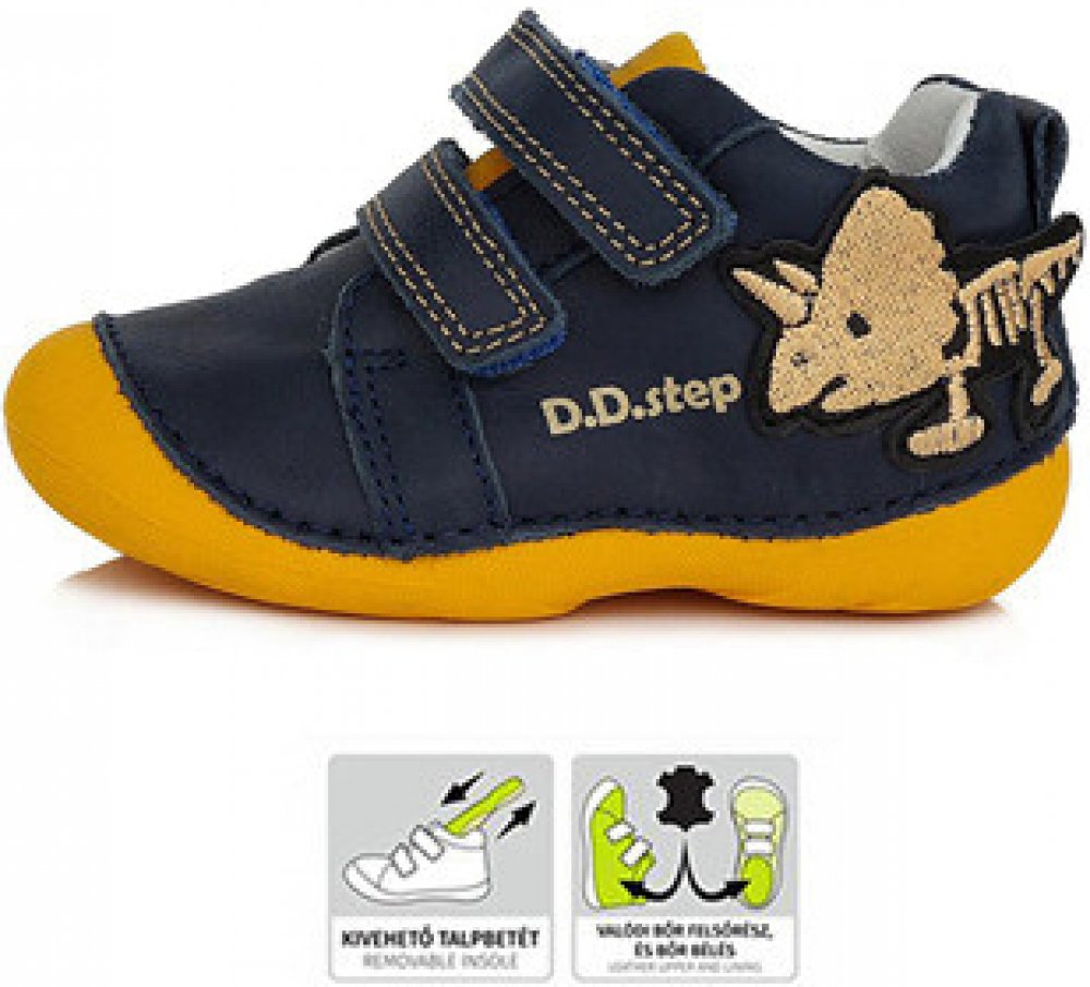 Vysoce prodyšná, kotníčková obuv z kvalitních hovězích a vepřových usní s vyjímatelnou absorpční stélkou a pevnějším opatkem.Velmi lehká, měkká podešev z přírodní pryže.Použité materiály zaručují flexibilitu a přizpůsobivost tvaru nožičky dítěte, prodyšnost obuvi a absenci toxických látek. Speciální stélky tlumící nárazy.Konstrukce obuvi je navržena tak, aby co nejvíce umožňovala přirozený růst dětské nožičky a pohyb chodidla při chůzi a běhu - zakulacená špice.Ohebné neklouzavé podešve s nízkou hmotností.Obuv D.D.Step se vyznačuje vysokým pohodlím a komfortem pro děti, které ji nosí, a přitom zcela podporuje zdravý vývoj dětské nožičky. Obuv D.D.Step se také vyznačuje atraktivním a nadčasovým vzhledem.Boty D.D.Step jsou vyráběny z měkkých kůží, jsou používány neklouzavé ohebné podešve a kožené stélky. Konstrukce obuvi je navržena tak, aby co nejméně bránila zdravému vývoji dětské nohy.
