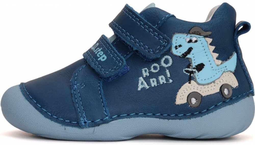 Celokožená obuv má svršek v chlapeckém modrém odstínu s nášivkou dinosaura. Suché zipy usnadní obouvání a utáhnete je dle potřeby. Pohodlí nožiček zajistí měkká kožená stélka i podšívka a flexibilní podešev. Prostor pro prsty je dostatečně široký, jsou použité zdravotně nezávadné materiály splňující požadované předpisy pro dětskou obuv a nebrání zdravému vývoji.