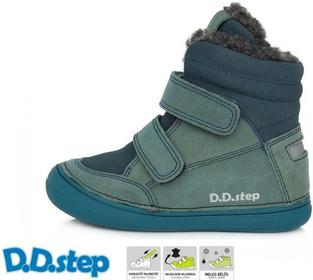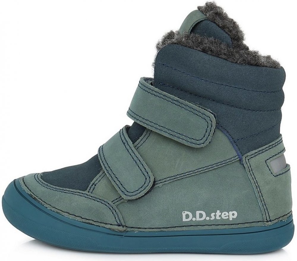 Dětské zimní kožené botičky D.D.step. Mají velmi nízkou hmotnost a měkkou, ohebnou a neklouzavou podešev. Pevný a vysoký opatek, vyjímatelná stélka s mírnou podporou klenby. Obuv je kompletně zateplená umělým kožíškem, včetně stélky.