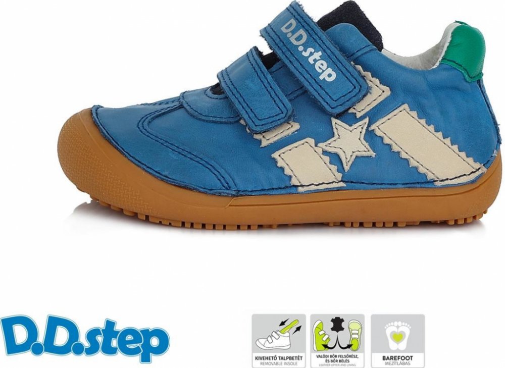 Kožená chlapecká obuv v modrém provedení má snadné zapínání na dva suché zipy. Obuv je velice pohodlná díky použitým přírodním materiálům, měkké kožené stélce a flexibilní podešvi typu barefoot simulující chůzi na boso. Obuv D.D. step je ze zdravotně nezávadných materiálů a podporuje zdravý vývoj nohou.