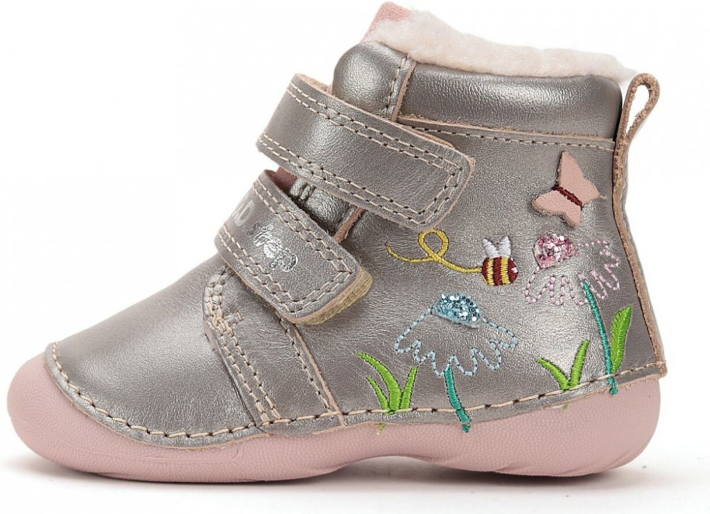 Dětské zimní kotníkové kožené lehké vycházkové botky s krásně ohebnou podešví, zateplené kožíškem, s anatomicky tvarovanou koženou stélkou a mírně zpevněným opatkem, okopová špička ochrání botičky před okopáním, střední střih, vhodné pro střední nožičky bez vysokého nártu
