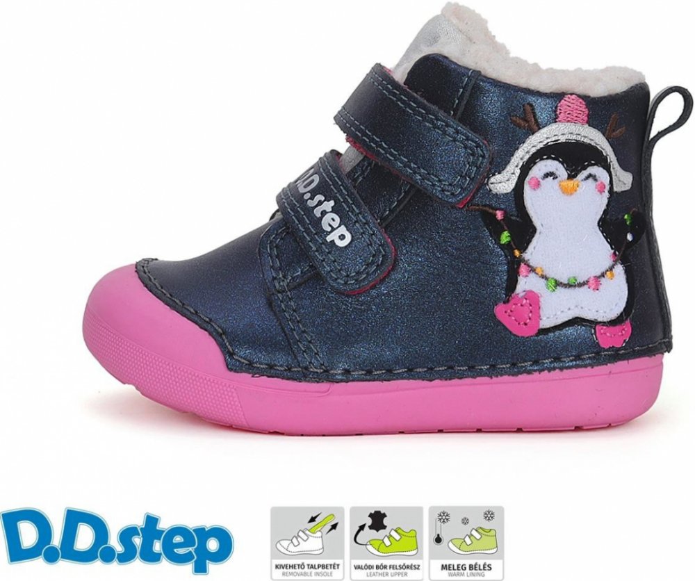 Obuv D.D.step se vyjímá díky růžovému odstínu podešve. Uvnitř má silný kožíšek i na stélce, která je měkká a anatomicky tvarovaná. Provedení podešve je velice měkké, flexibilní. Má zvýšenou špici, čímž brání okopu svršku. Prostor pro prsty je dostatečně široký a nebrání zdravému vývoji chodidla.