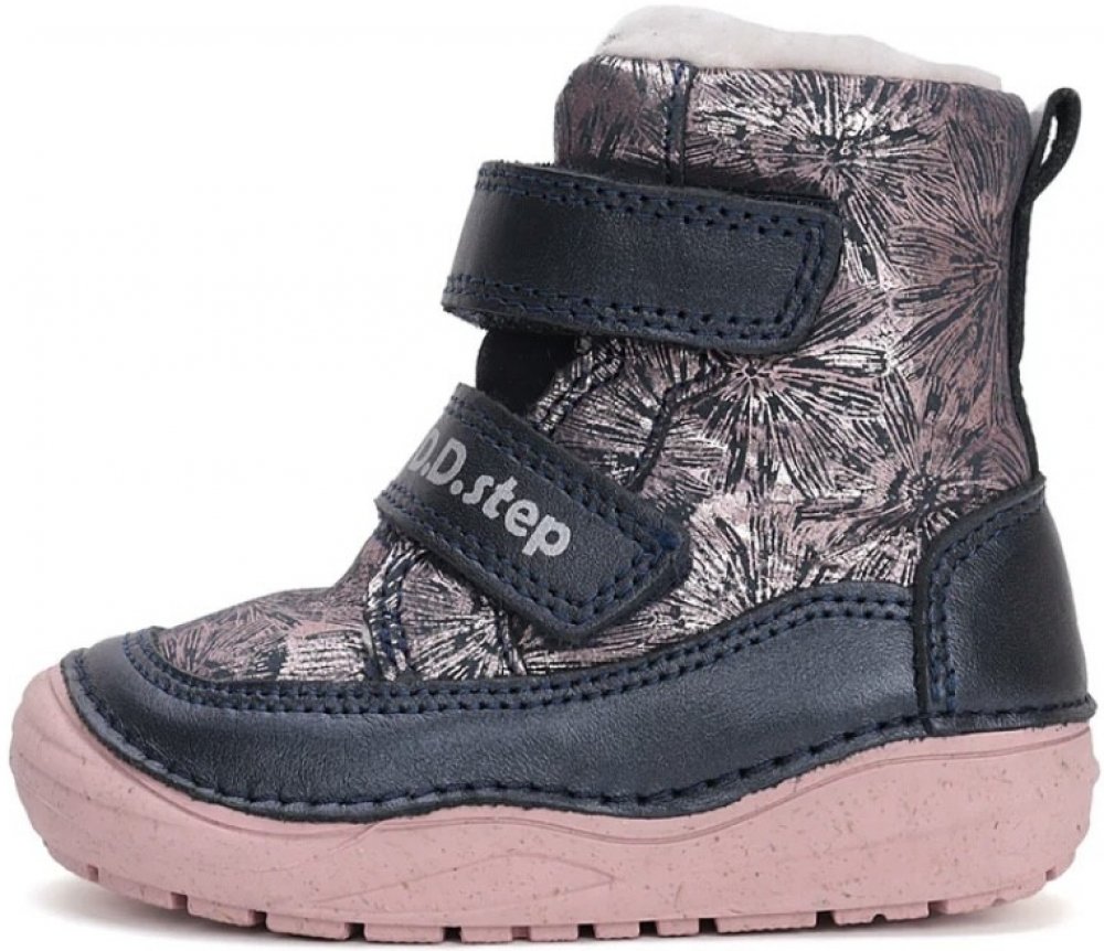 Dívčí zimní kožené boty s praktickým okopem. Prvky barefoot a klasického stylu - širší přední část s dostatečným prostorem pro prsty a ohebná podrážka s pevným opatkem pro správné držení nohy a kotníku. Kožená obuv s velmi měkkou podešví, vyvinuta pro maximální flexibilitu a lehkost obuvi, která vyhovuje současným trendům na odlehčenou a flexibilní obuv a současně vyhovuje zdravotním požadavkům. Pevný opatek. Svršek obuvi - hladká kůže. Podšívka obuvi - kožíšek. Vyjímatelká pěnová kožená stélka s naznačenou podporou klenby a minimálním tvarováním s možností kontroly velikosti. Extrémně lehká a pružná podrážka. Zapínání na 2 suché zipy. Hlavní přednosti: - použité přírodní materiály, testované v české laboratoři - speciální technologie šití zaručující flexibilitu a komfort - kulatá a prostorná špička poskytující dostatečný prostor pro prsty - ohebné měkké neklouzavé podešve s nízkou hmotností - vyjímatelná stélka - v předu mírný okop chránící špičku - vhodná i pro začínající chodce - zpevněný opatek Délka vnitřní stélky obuvi: velikost 20 - 13,1 cm - šířka 5,5 cm velikost 21 - 13,7 cm - šířka 5,6 cm velikost 22 - 14,4 cm - šířka 5,7 cm velikost 23 - 15 cm - šířka 5,9 cm velikost 24 - 15,7 cm - šířka 6,1 cm velikost 25 - 16,4 cm - šířka 6,3 cm velikost 26 - 17 cm - šířka 6,4 cm velikost 27 - 17,6 cm - šířka 6,5 cm velikost 28 - 18,2 cm - šířka 6,6 cm velikost 29 - 18,9 cm - šířka 6,7 cm velikost 30 - 19,6 cm - šířka 6,8 cm velikost 31 - 20,2 cm - šířka 6,9 cm Naměřené údaje ± 2 mm. Obuv D.D.step se vyznačuje vysokým pohodlím a komfortem a atraktivním vzhledem. Boty D.D.step jsou vyráběny z měkkých kůží, jsou používány neklouzavé ohebné podešve a kožené stélky. Použité materiály zaručují flexibilitu a pohodlí pro dětskou nožičku. Konstrukce obuvi je navržena tak, aby co nejméně bránila zdravému vývoji dětské nohy.
