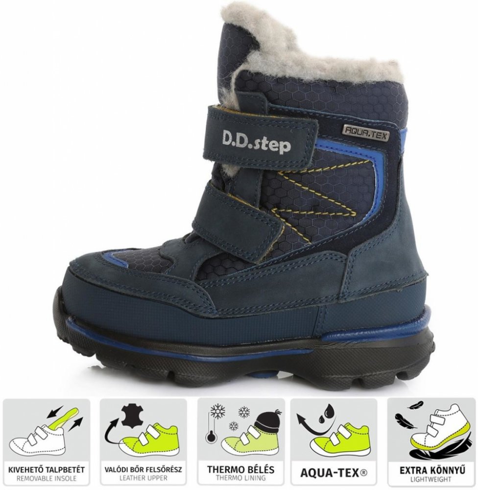 Zimní obuv D.D.step má pod svrškem membránu AquaTex, která zabraňuje prostupu vlhkosti do obuvi a přitom umožňuje odvod par, čímž budou nohy v suchu. Teplo zajistí i silnější kožíšek. Měkká stélka spolu se vzorovanou flexibilní podešví tlumí nárazy při došlapu a chůze je proto pohodlná.