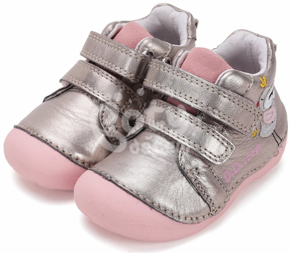 Dívčí kožené boty s praktickým okopem. Prvky barefoot a klasického stylu - širší přední část s dostatečným prostorem pro prsty a ohebná podrážka s pevným opatkem pro správné držení nohy a kotníku. Kožená obuv s velmi měkkou podešví, vyvinuta pro maximální flexibilitu a lehkost obuvi, která vyhovuje současným trendům na odlehčenou a flexibilní obuv a současně vyhovuje zdravotním požadavkům. Pevný opatek. Svršek obuvi - hladká kůže. Podšívka obuvi - kůže. Vyjímatelká pěnová kožená stélka s naznačenou podporou klenby a minimálním tvarováním s možností kontroly velikosti. Extrémně lehká a pružná podrážka. Zapínání na 2 suché zipy. Hlavní přednosti: - použité přírodní materiály, testované v české laboratoři - speciální technologie šití zaručující flexibilitu a komfort - kulatá a prostorná špička - ohebné měkké neklouzavé podešve s nízkou hmotností - v předu mírný okop chránící špičku - vhodná i pro začínající chodce - zpevněný opatek Délka vnitřní stélky obuvi: velikost 19 - 12,4 cm - šířka 5,4 cm velikost 20 - 13,1 cm - šířka 5,5 cm velikost 21 - 13,7 cm - šířka 5,6 cm velikost 22 - 14,4 cm - šířka 5,8 cm velikost 23 - 15 cm - šířka 6 cm velikost 24 - 15,7 cm - šířka 6,2 cm Naměřené údaje ± 2 mm. Obuv D.D.step se vyznačuje vysokým pohodlím a komfortem a atraktivním vzhledem. Boty D.D.step jsou vyráběny z měkkých kůží, jsou používány neklouzavé ohebné podešve a kožené stélky. Použité materiály zaručují flexibilitu a pohodlí pro dětskou nožičku. Konstrukce obuvi je navržena tak, aby co nejméně bránila zdravému vývoji dětské nohy.