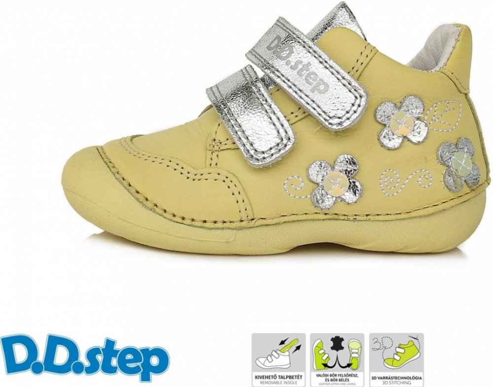 Dívčí obuv má svršek v pastelově žlutém odstínu s pásky na suchý zip ve stříbrném třpytu. Suché zipy usnadní obouvání a utáhnete je dle potřeby. Pohodlí nožiček zajistí měkká kožená stélka i podšívka a flexibilní podešev. Prostor pro prsty je dostatečně široký, jsou použité zdravotně nezávadné materiály splňující požadované předpisy pro dětskou obuv a nebrání zdravému vývoji.