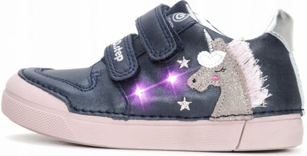 Krásná novinka celoroční blikací obuvi s aplikací jednorožce na tmavě modrém podkladu.