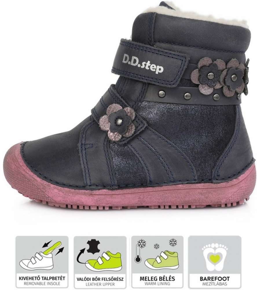 Zimní dívčí obuv má podešev typu Barefoot simulující chůzi na boso. Svršek je kožený, pro prsty je dostatečně široký prostor, aby nebylo bráněno zdravému vývoji. Výhodou je zvýšený okraj špice bránící okopu. Zapínání na suché zipy umožňuje dostatečné rozevření obuvi a snadné obutí. Uvnitř jsou zatepleny silným kožíškem i na stélce a proto budou nohy v teple.
