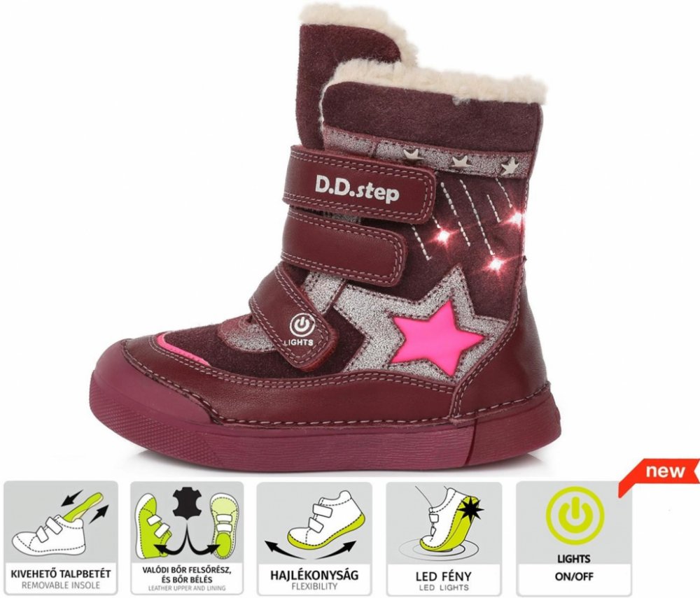 Dívčí obuv v hezkém vínovém odstínu je střihem ve vyšším provedení, nahoře vykukuje silný kožíšek, kterým je tato obuv zateplená na podšívce i stélce. Zapíná se na suché zipy a po jejich rozepnutí noha snadno vklouzne dovnitř. Špice je dostatečně široká, aby prsty měly dostatek prostoru a mohly se zdravě vyvíjet. Podešev je tenká, flexibilní. Při každém došlapu se rozsvítí LED žárovky na boku obuv...