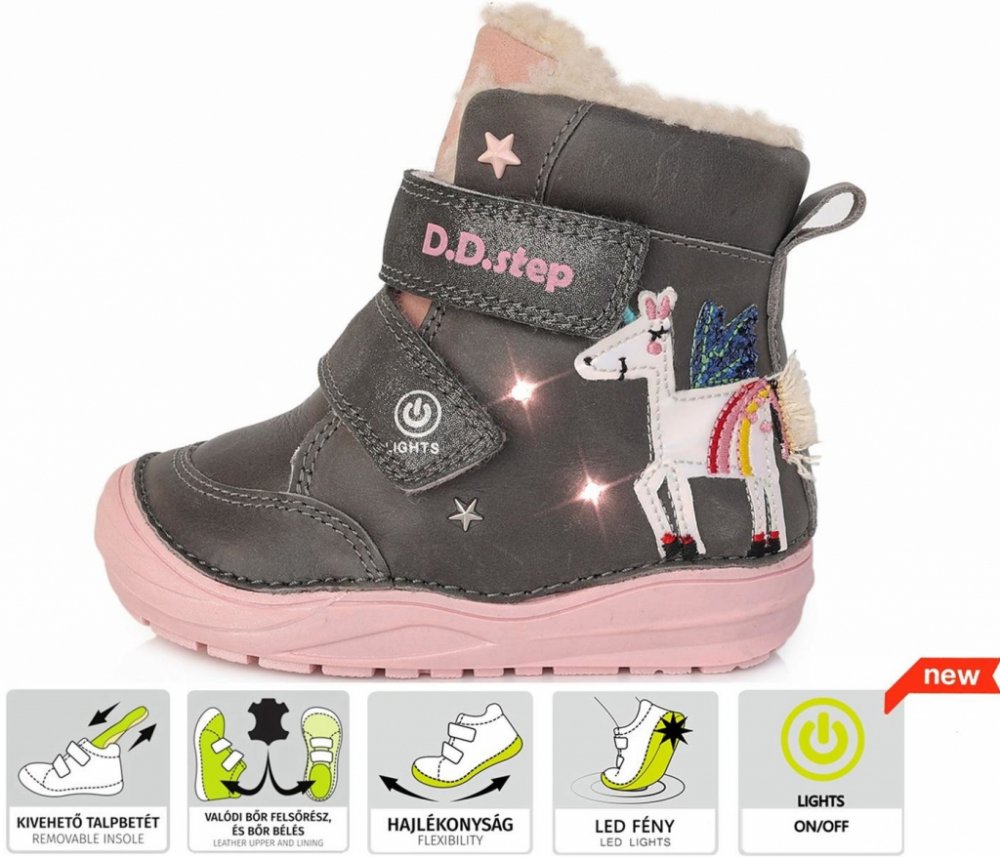 Dívčí obuv s motivem koníka je střihem ve vyšším provedení nad kotníky, kde vykukuje silný kožíšek, kterým je tato obuv zateplená. Zapíná se na suché zipy a po jejich rozepnutí noha snadno vklouzne dovnitř. Špice je dostatečně široká, aby prsty měly dostatek prostoru a mohly se zdravě vyvíjet. Podešev je tenká, flexibilní, pod patou má soft shock pro tlumení nárazů při došlapu. Při každém došlapu...