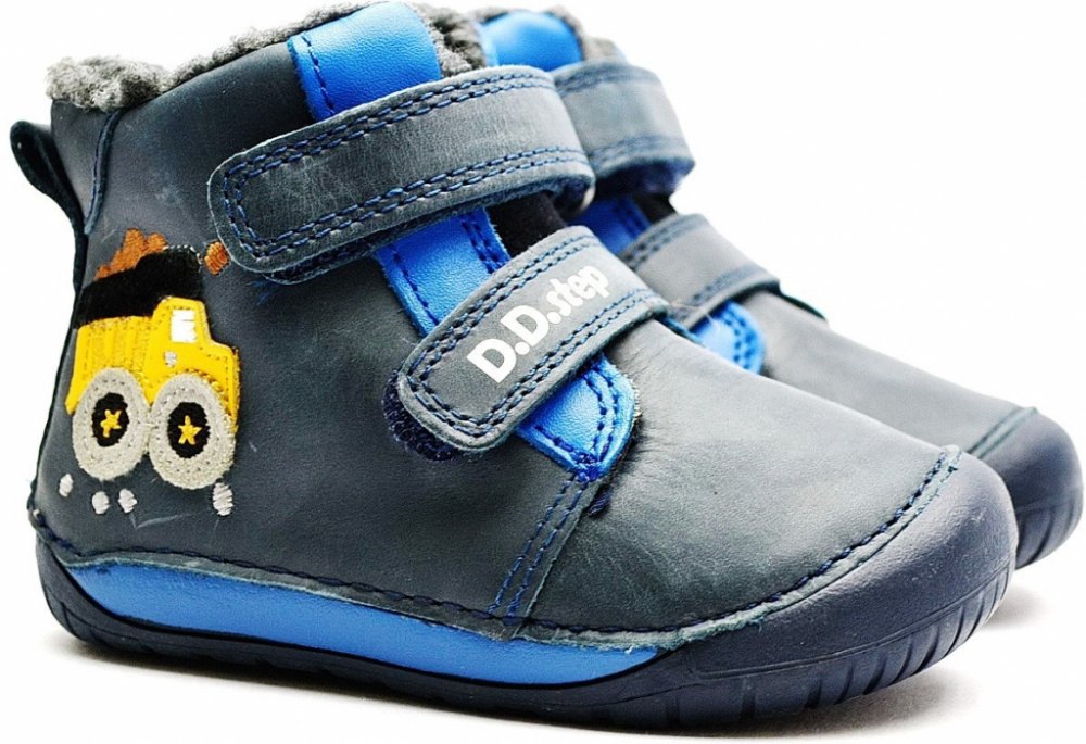 Dětské zateplené kotníkové kožené barefoot vycházkové botky s krásně ohebnou podešví a rovnou vyjímatelnou stélkou. Bez zpevněného opatku. Dostatečná šířka v místě pro prsty umožňuje přirozený a zdravý vývoj dětských nohou. Okopová špička ochrání botičky před okopáním,