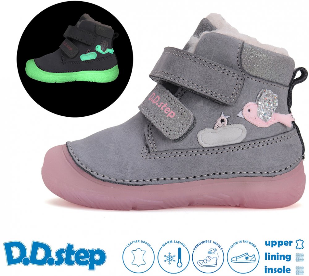 - Popis: dívčí kožená zdravotní zimní obuv. Obuv, která je skvěle propracovaná i svou šíří v prstové části. Rozšířenější styl. Fosforující podešev a obrázky.