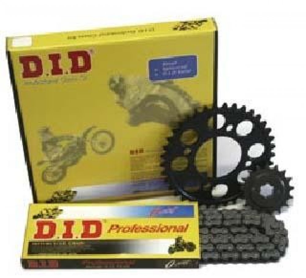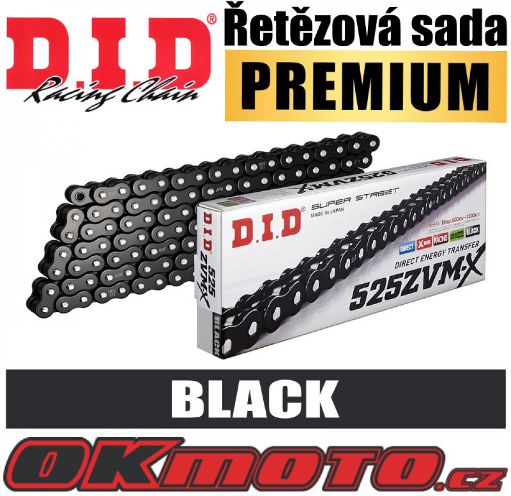 Kompletní řetězová sada D.I.D, obsahující řetěz DID 525VX3 X-ring - 108 článků, zlatá barva, řetězovou nýtovací nebo rozebíratelnou spojku, kalené přední kolečko SUNSTAR typ 1422-16 zubů nebo kalené OGNIBENE s tlumicí gumou typ 367164R16 zubů, kalenou rozetu SUNSTAR typ 94695-43 zubů. Požadavek jiného počtu zubů řetězových kol uveďte do poznámky při objednávce.