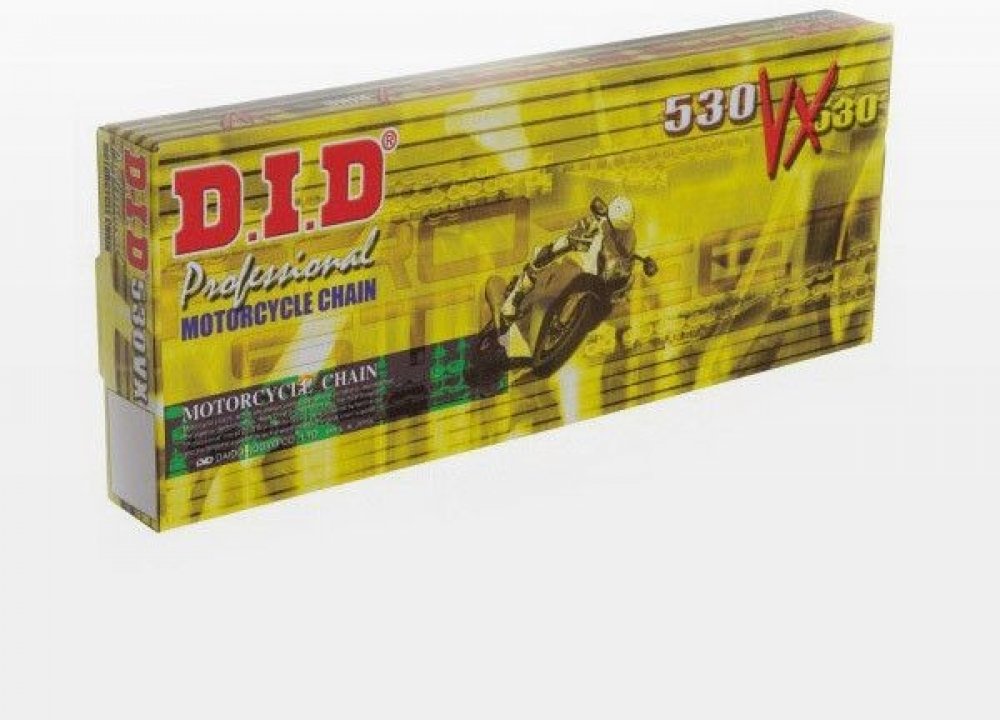 Kompletní řetězová sada D.I.D, obsahující řetěz DID 530VX3 X-ring - 106 článků, STEEL (kovová) barva, řetězovou nýtovací spojku, kalené přední kolečko SUNSTAR typ 1524-18 zubů nebo kalené OGNIBENE s tlumicí gumou typ 367132R18 zubů, kalenou ocelovou rozetu SUNSTAR typ 95698-42 zubů. Požadavek jiného počtu zubů řetězových kol uveďte do poznámky při objednávce.