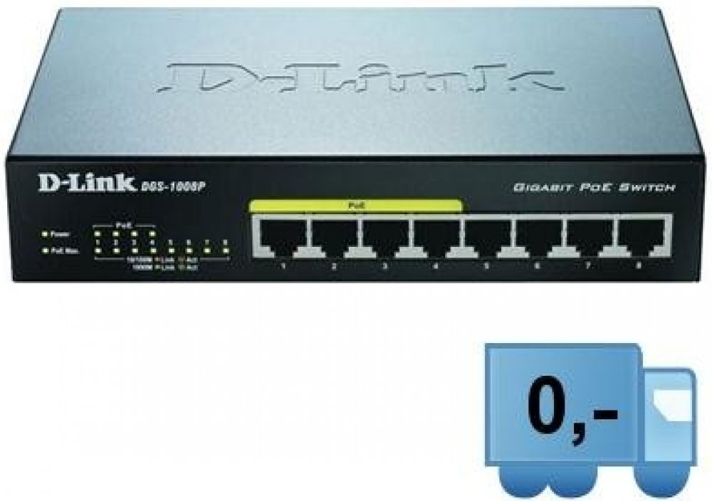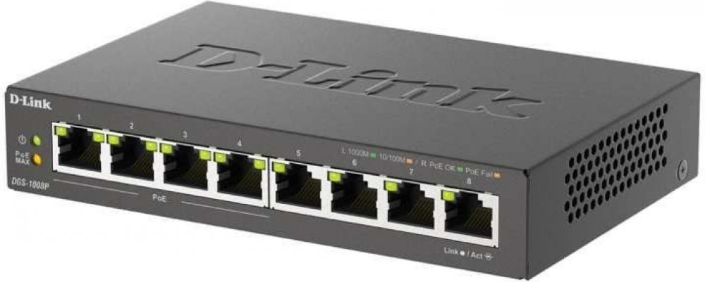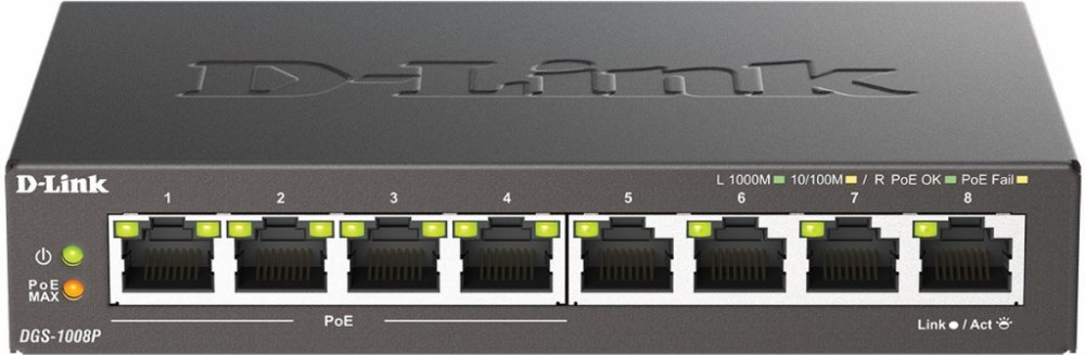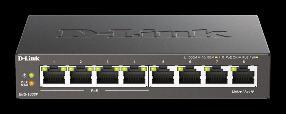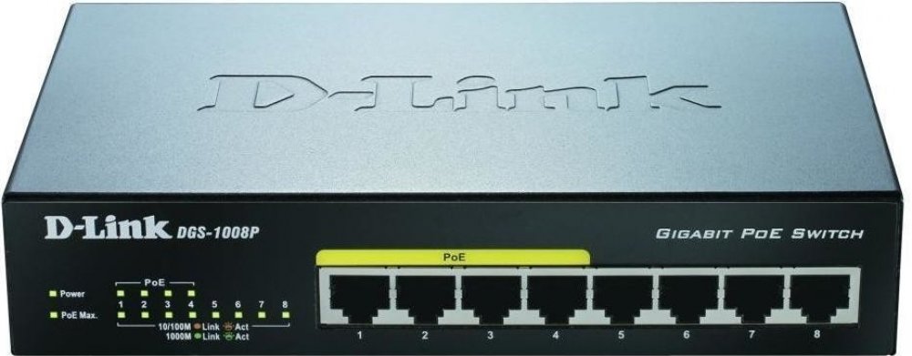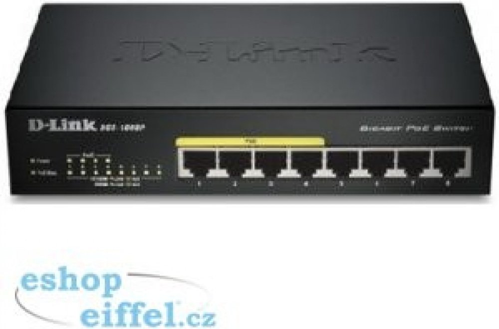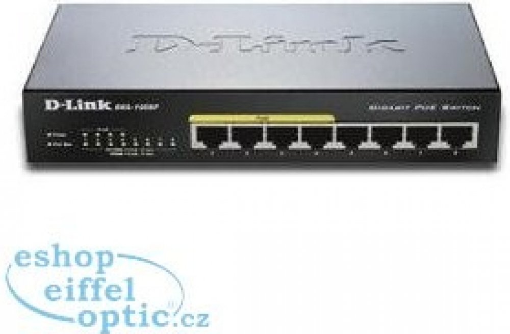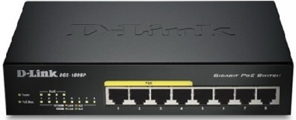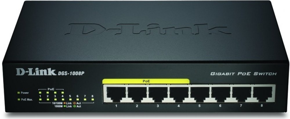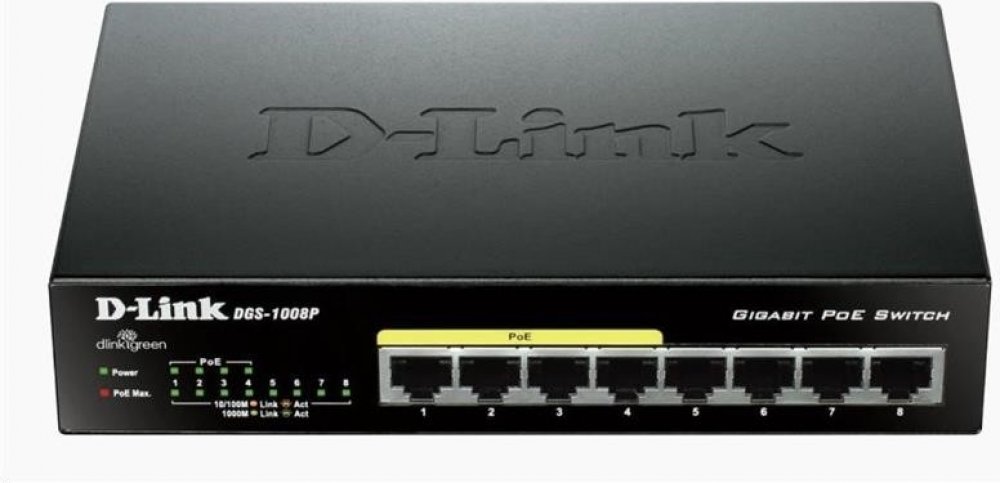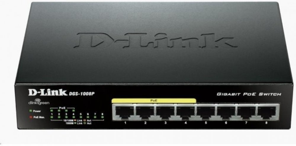 Gigabitový stolní přepínač DGS-1008P dává malým/domácím kancelářím (SOHO) a malým/středním firmám (SMB) cenově výhodnou možnost využívat technologii Power over Ethernet (PoE) pro napájení bezdrátových přístupových bodů (AP), síťových kamer nebo IP telefonů přímo přes ethernetové kabely. DGS-1008P je vybaven gigabitovými porty pro rychlejší přenos dat a technologií D-Link Green Ethernet pro úsporu energie v době, kdy se přepínač nepoužívá. Je zcela tichý, protože neobsahuje ventilátor, a je proto ideální pro kanceláře, knihovny nebo zasedací místnosti.