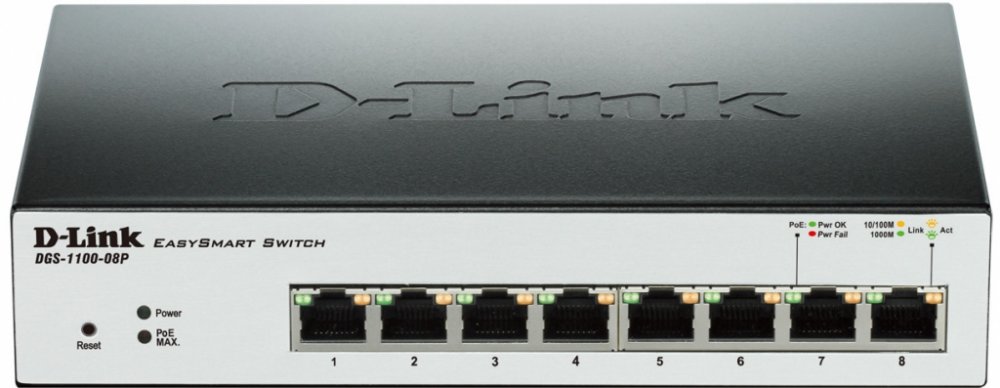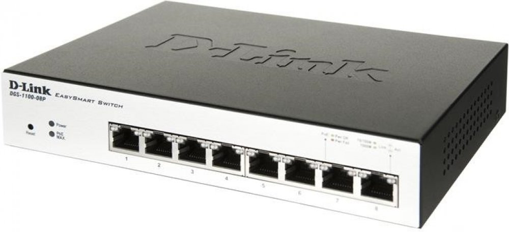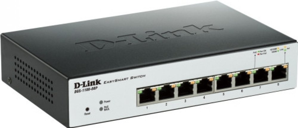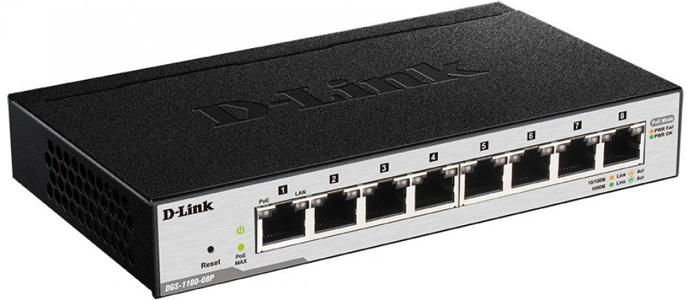 DGS-1100-08P: 8-Port Gigabit PoE Smart Managed Switch (8 x PoE ports, fanless)