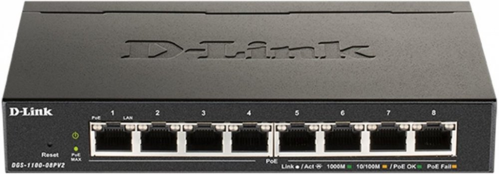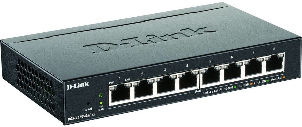 D-Link DGS-1100-08PV2 je 8-portový Gigabit Smart řízený PoE přepínač v kompaktním kovovém provedení bez ventilátorů, pro položení na stůl, na poličku nebo montáž na zeď. Všech 8 portů 10/100/1000M RJ-45 podporuje PoE+ napájení dle 802.3af / 802.3at (max. 30W na port). Celkový PoE výkon přepínače je 64W. Switch nabízí základní sadu L2 funkcí (např. VLAN, QoS, IGMP Snooping, agregace linek) s možností správy z webového rozhraní, pomocí SNMP příkazů nebo nástroje D-Link Network Assistant (DNA). Switch je určený především pro kanceláře (SOHO), malé a střední podniky (SMB) a kamerové systémy (CCTV).