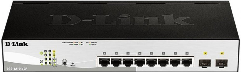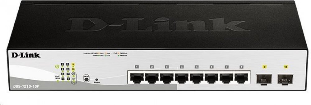 10-port 10/100/1000 Gigabit PoE Smart Switch including 2 SFP - 8 x 10/100/1000Mbps Auto-Negotiating Port - 2 x 100/1000Mbps SFP Port - dlink|green 3.0, advance power saving features, time-based PoE - 802.3az Energy Efficient Ethernet (EEE) port power save in idle mode - 802.3af & 802.3at, max PoE budget 65W - Fanless design - Half-/Full-Duplex, auto-negotiation, Auto MDI/MDIX - IEEE 802.3x Flow Control - 802.3ad Link Aggregation - 802.1D/802.1w/802.1s Multiple Spanning Tree - Asymmetric VLAN, Auto Voice/Surveillance VLAN - LLDP/LLDP-MED - 802.1p priority queues, CoS by ToS, TCP/UDP-Port and IPv6 Traffic Class - MAC/IP filtering - MAC/IP-based ACL - Static Routing and Default Route - 802.1X port-base Access Control, Port Security - D-Link Safeguard Engine - Dual Image - Network Assistant, web based management, compact CLI, IPv4/IPv6 Dual Stack, IPv6 Ready - D-View support - Compact 13" desktop enclosure, 19" Rackmount installation - Firmware Release 6 not backward compatible tp Hardware Version C1.