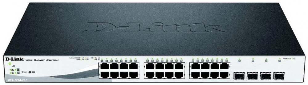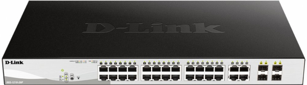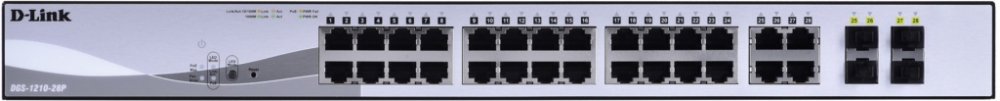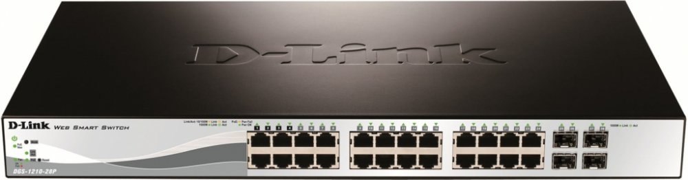 D-Link DGS-1210-28P. Typ přepínače: Řízený, Přepínač vrstev: L2. Typy přepínaných ethernetových portů RJ-45: Gigabit Ethernet (10/100/1000), Počet přepínaných ethernetových portů RJ-45: 28. Plně duplexní režim. Tabulka MAC adres: 16000 pol., Kapacita přepínání: 56 Gbit/s. Síťové standardy: IEEE 802.3, IEEE 802.3ab, IEEE 802.3af, IEEE 802.3at, IEEE 802.3u, IEEE 802.3x. Podpora napájení po Ethernetu (PoE). Instalace do racku, Formát: 1U