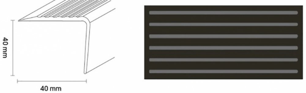 Schodišťová hrana Döllken Profiles TKNG A 40 moderní hrana schodiště pro designové krytiny, CV a linoleum (100% bez změkčovadel). Vyrobeno z polyblendu na bázi PVC (všechny přísady jsou v souladu s REACH). Neškodné použití - nepoužívání ftalátů (změkčovadel). Moderní a štíhlý vzhled. Fosforeskující (dosvit) hrana. Protiskluzová minimálně R10.