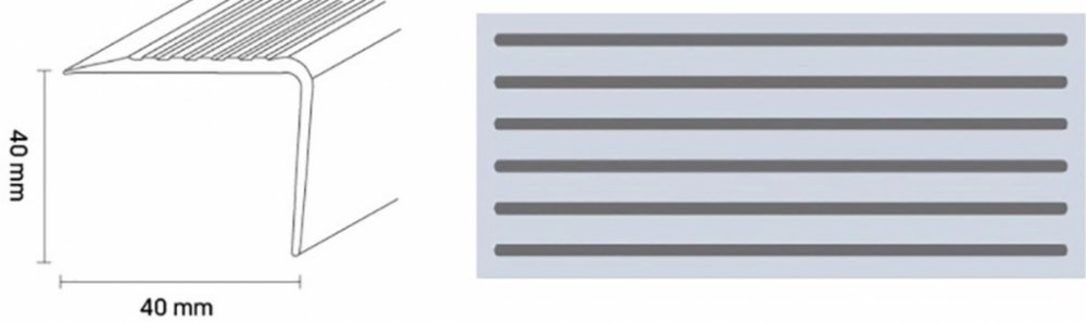 Schodišťová hrana Döllken Profiles TKNG A 40 moderní hrana schodiště pro designové krytiny, CV a linoleum (100% bez změkčovadel). Vyrobeno z polyblendu na bázi PVC (všechny přísady jsou v souladu s REACH). Neškodné použití - nepoužívání ftalátů (změkčovadel). Moderní a štíhlý vzhled. Fosforeskující (dosvit) hrana. Protiskluzová minimálně R10.