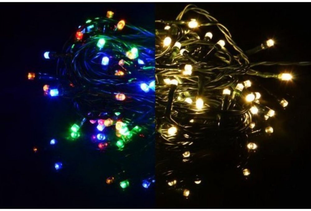 Světelný řetěz vhodný pro vnitřní i venkovní použití - jak na okno či chodbu, tak i na dům či stromek. Osvětlení není výhradně určeno pro dobu Vánoc, ale můžete ho využít i pro osvětlení Vašeho stanu či zahrady během letních měsíců. Světelný řetěz má 9 blikajících funkcí vč. změny barvy z barevné na teple bílou.LED diody jsou oblíbenou náhradou za klasické žárovky. Oproti klasickým žárovkám LED diody nevyzařují teplo, jsou odolné proti otřesům a můžete díky nim ušetřit téměř až 90% energie, které byste jinak spotřebovali na klasické žárovky. Průměrná životnost LED diody je 2000 hodin svícení (normální žárovka cca 1000 hodin v závislosti na svítivosti).LED řetěz splňuje německé normy a je na něj vystaven certifikát bezpečnosti GS. Splňuje stupeň krytí IP 44 (pro venkovní použití). Světelné funkce:teple bílá - svítírůznobarevná - svítíteple bílá - blikárůznobarevná - blikázměna barvy z teple bílé na barevnoupřechod z teple bílé na barevnou - blikajícípřechod z teple bílé na barevnou - pomalý přechodpomalé stmívání teple bílého světlavypnuto Technické údaje:délka osvětlení: cca 29,9 mdélka napájecího kabelu: cca 10 mcelková délka: cca 39,9 mbarva kabelu: zelenározestup mezi světly: 10 cmzměna barvy: barevné/teple bíléjednotlivě přepínatelnépro vnitřní i venkovní použití Obsah balení:1x vánoční osvětlení vč. napájení