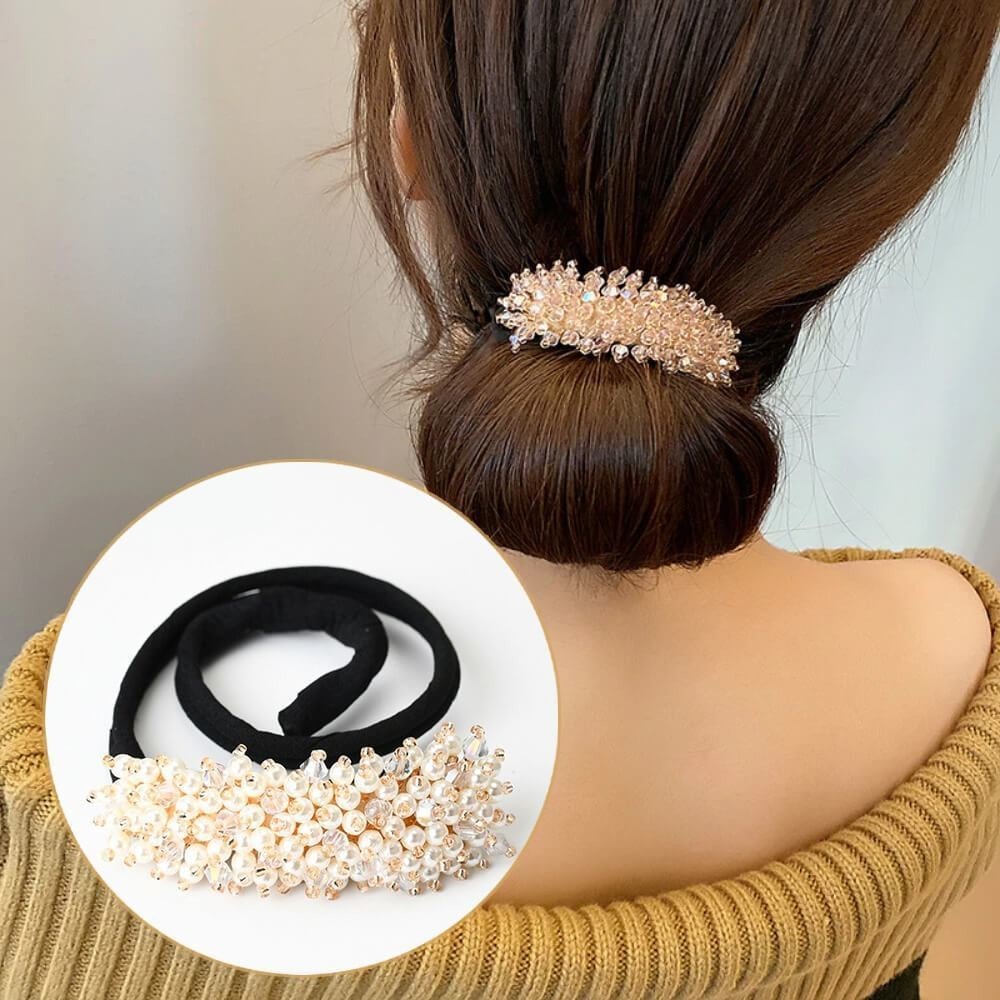 Provlékněte své vlasy očkem ozdoby a stáhněte tak, aby ozdoba byla u konečků vlasů. Poté začněte vlasy na ozdobu namotávat, dokud se nedostanete k temeni hlavy. Část s namotanými vlasy zarolujte do drdolu a část s kamínky poté omotejte kolem drdolu.