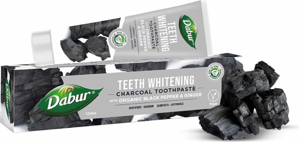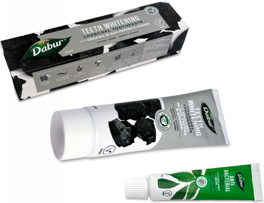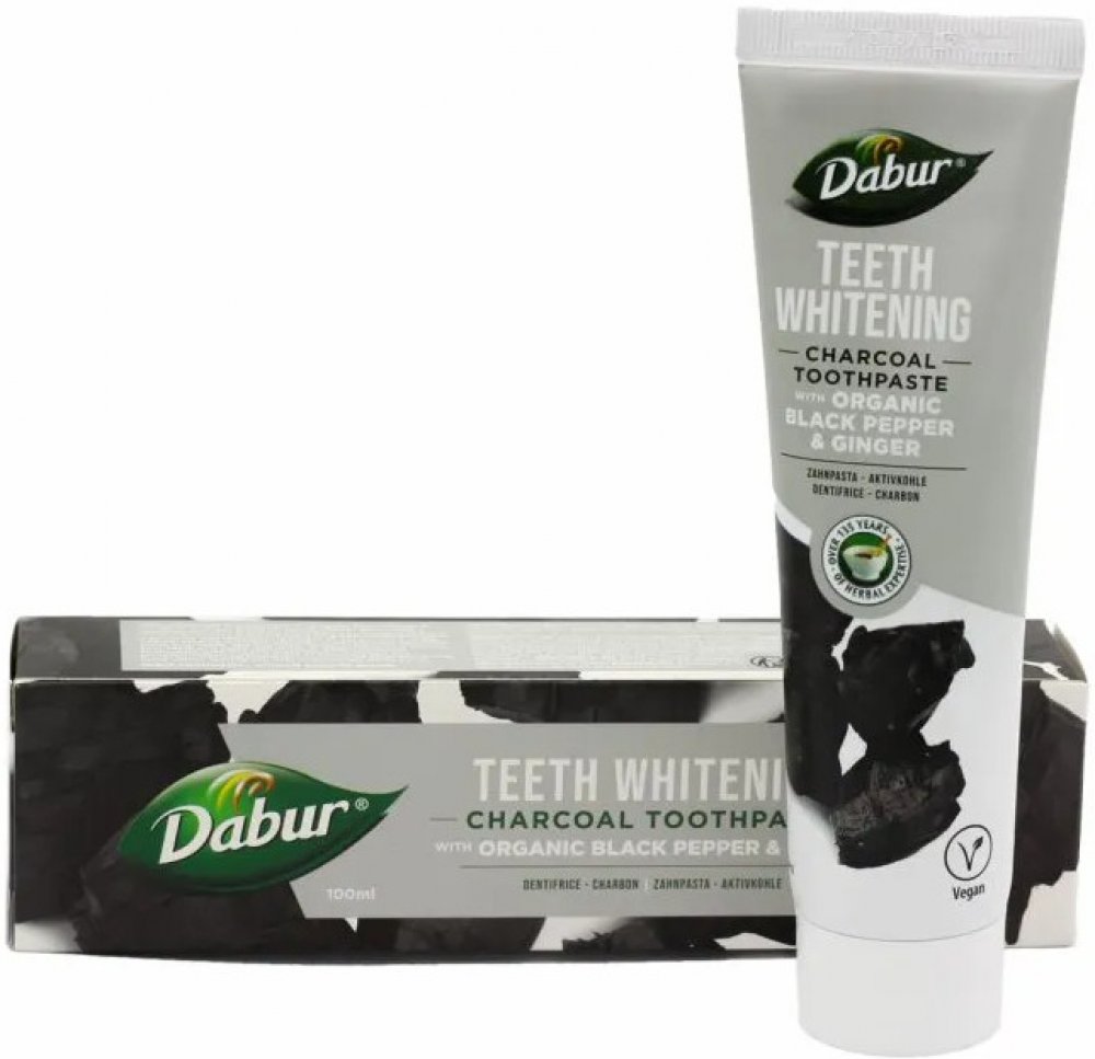 Kořeněná zubní pasta Dabur s bělicím účinkem je tvořena unikátní recepturou, která v sobě kombinuje sílu uhlí, bylin a koření. Obsahuje aktivní uhlí, které jemně a šetrně odstraňuje nežádoucí zbarvení zubní skloviny, které vzniká vlivem pití kávy, vína, čaje či kouřením. Díky svým adhesivním vlastnostem na sebe tyto nečistoty váže a tak je za pomocí čištění zubů pomáhá redukovat. Kombinace výtažků z organického dlouhého a černého pepře a zázvoru působí antibakteriálně, je prevencí kazů, dezinfikuje dutinu ústní a snižuje citlivost zubů, také pečuje o sklovinu a dásně.